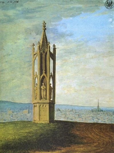 Wir fuhren die Straße nun, auf die ich mich schon so oft geträumt hatte, daß ich auf dem Weg nach Rom> begriff zu sein. Bei der gotischen Gedächtnissäule, die die Spinnerin am Kreuz heißt, welche vor der Stadt auf dem Wiener Berg liegt, sahen wir Wien noch einmal an und nahmen Abschied von ihm.