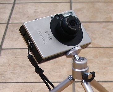 Abbildung 1) Canon IXUS 70 auf Ministativ: Mit dieser handlichen Kombination wurden die meisten Aufnahmen für die Beispiellichtkurven gewonnen. Für die gewählte Belichtungszeit von 15 Sekunden ist keine Nachführung erforderlich. Die Kombination ist immer dabei und in Sekunden aufnahmebereit. Das Gesamtgewicht beträgt nur 230 Gramm. Eine ideale "Reisesternwarte"...