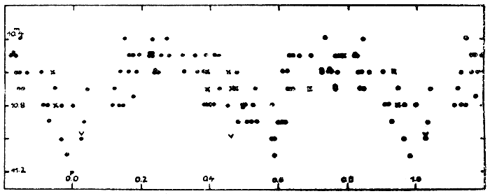 Sonneberger Himmelsüberwachungsplatten aus den Jahren 1950-1958. Diese 120 Schätzungen ermöglichten die Bestimmung von 16 Minima (wobei man bei der geringen Anzahl von Schätzungen, die ja letztlich die ganze Phase abdecken, keine sonderlich genaue Minimumsbestimmung erwarten kann) und einer reduzierten Lichtkurve. Die Durchsicht von 750 weiteren SHÜ-Platten auf der Suche nach Schwächungen (also keine Schätzungen) ergab 32 weitere Schwächungen, die die Elemente: