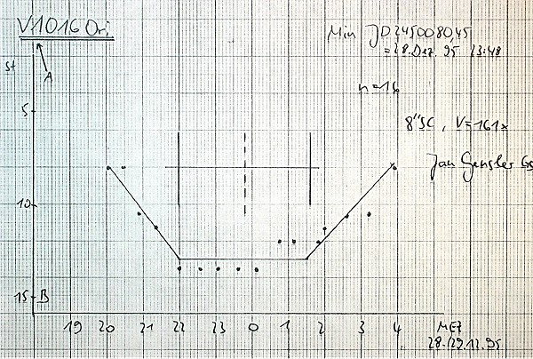 Links ist V1016 Ori im Normallicht (12.01.1992, 23h00MEZ), rechts im Minimum (04.02.1995, 22h05MEZ).