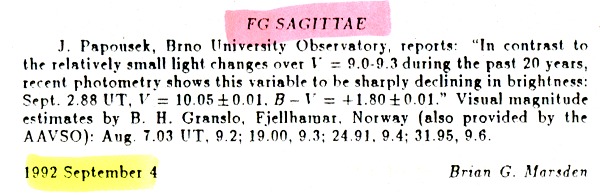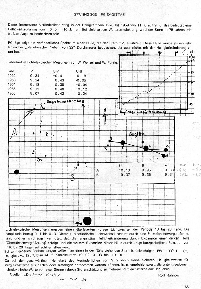 Mit diesem Hinweis auf FG Sge in "Sterne und Weltraum" 6/1970 wurde mein Interesse an Veränderlichen Sternen zum erstenmal geweckt. Die Zeitschrift war 1970 für mich als Schüler nahezu unerschwinglich, denn sie kostete immerhin 3,60 DM... FG Sge war trotz der damaligen Helligkeit von ca 9mag für mich noch nicht beobachtbar. Zwar hatte ich zu dieser Zeit einen 60mm-Refraktor, es fehlten aber vernünftige und erschwingliche Sternkarten. Für eine leserliche Variante: auf das Bild clicken! |
