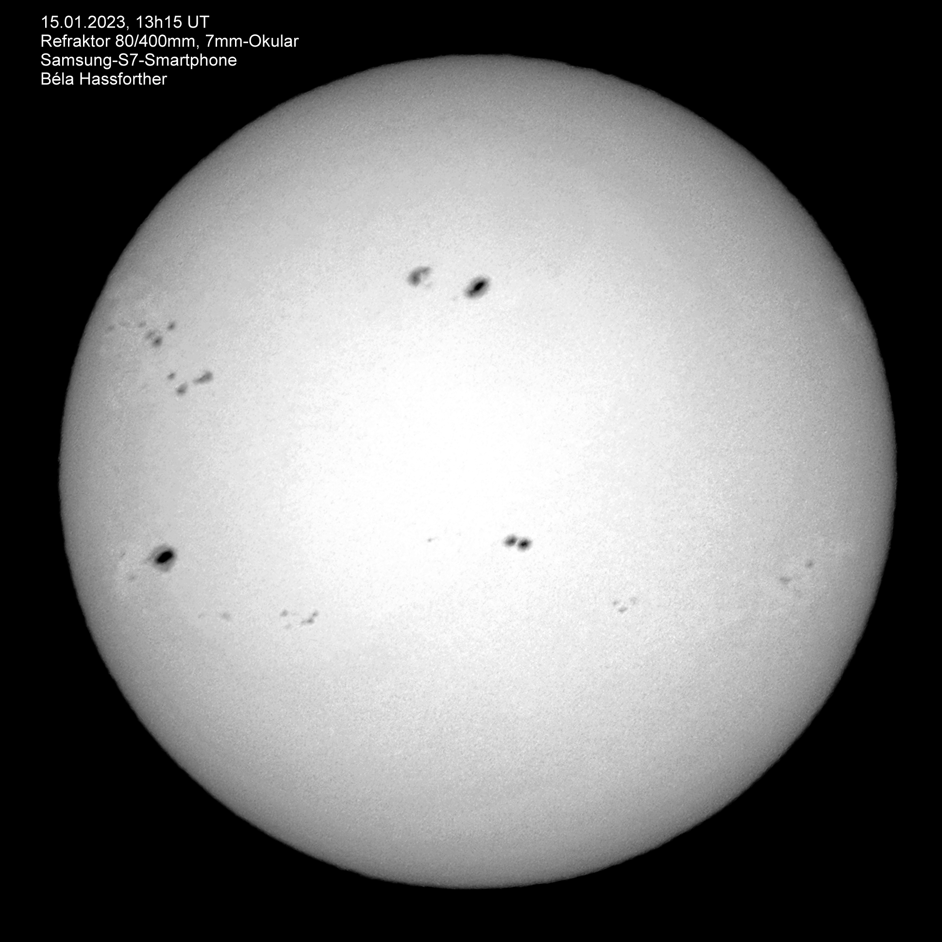 Aufnahmedaten: 15.01.2023, 13h15UT. Smartphone Samsung S7 hinter Refraktor 80/400 mit Okular f=7mm, Baader Sonnenfilterfolie. Größeres Bild.