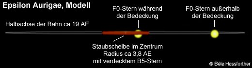 Auf der diesjährigen Tagung der American Astronomical Society präsentierten Hoard, Howell & Stencel ein neues Modell des Systems, bei dem entgegen früherer Annahmen der F-Stern kein Überriese ist, sondern ein Post-Asymptotic-Giant-Branch-Objekt mit einer erheblich reduzierten Masse (ca 2,2-3,3 statt wie früher angenommen 15 Sonnenmassen). Im Zentrum des Systems steht also der unsichtbare aber massereichere B5-Hauptreihenstern, der von einer Staubscheibe verhüllt wird. Alle 27 Jahre wandert der F-Stern dann hinter die Staubscheibe, und somit reduziert sich das Licht des Gesamtsystems. Hier eine maßstabsgerechte Skizze des Modells:
