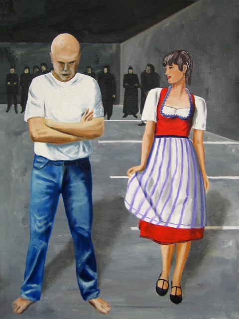 Weitergemalt am aktuellen Bild, mit der linken Gestalt fast fertig geworden. Als Arbeitstitel stelle ich mir inzwischen "Garagentraum" vor.